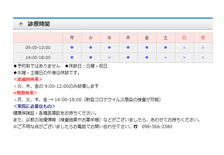 内科、循環器内科、糖尿病内科、皮膚科、特定健診、予防接種、他