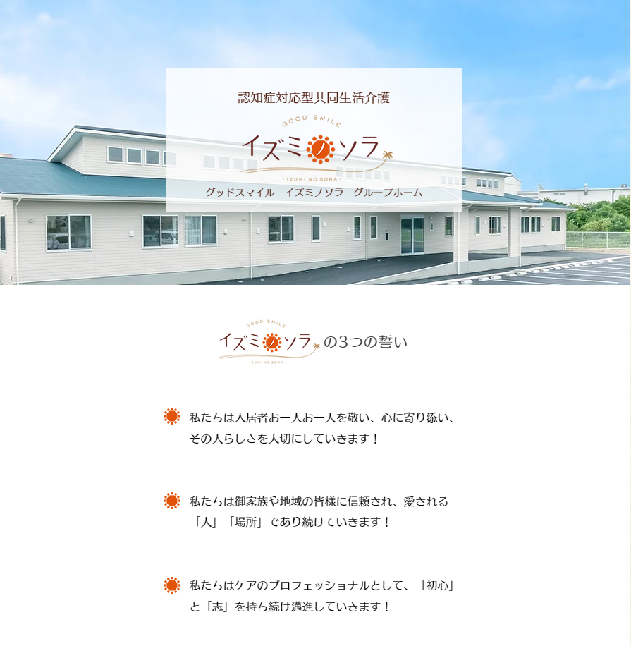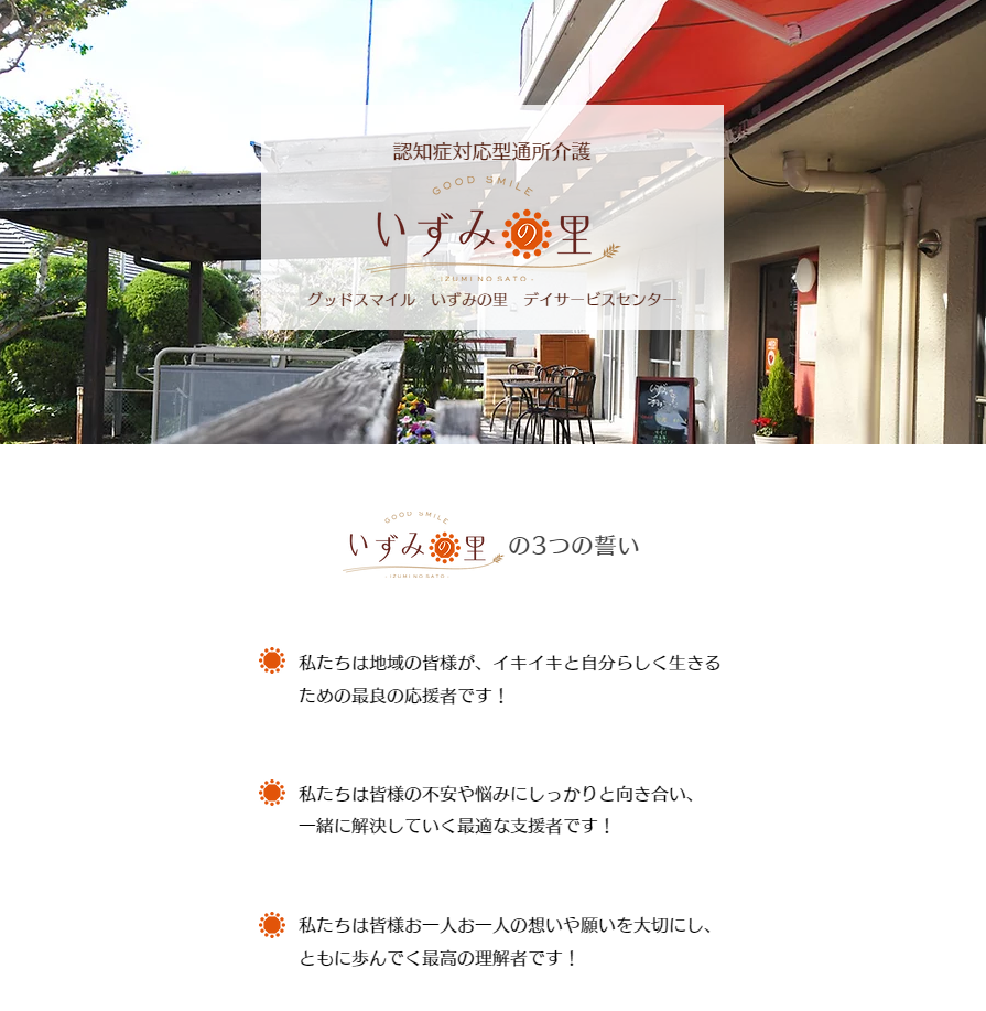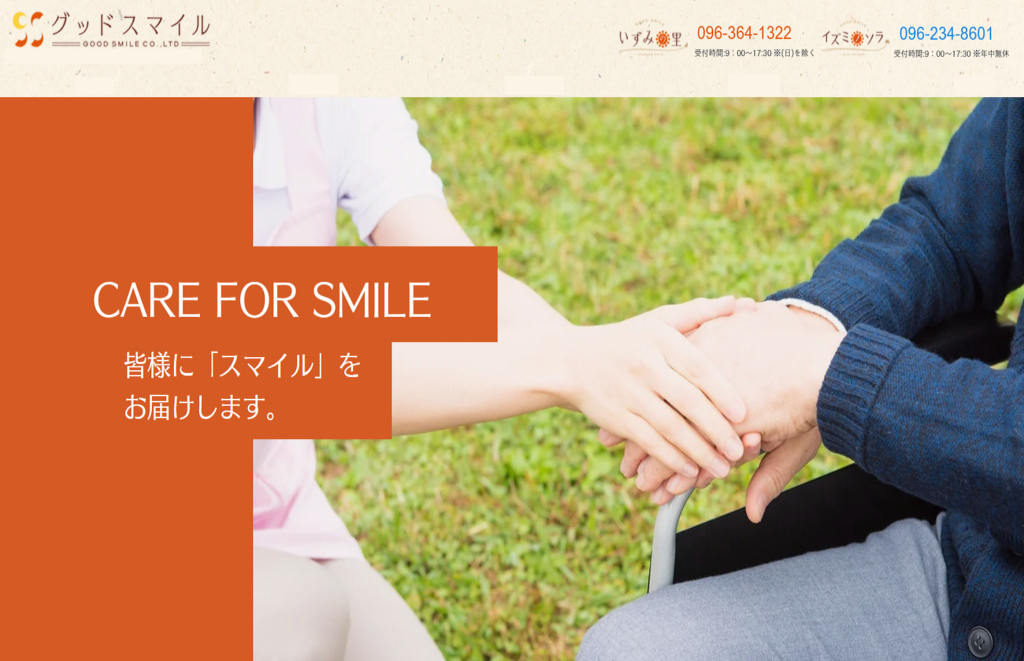 「CARE FOR SMILE」を合言葉に、御利用者はもちろん御家族、地域の皆様、そしてケアを行うスタッフ皆が「笑顔」になれるようこれからも努力してまいります。